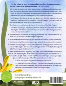 Im zweiten Buch steht ein bisher wenig beachteter Aspekt im Mittelpunkt: Das nähere Umfeld eines Krebspatienten. Angehörige, Freunde Arbeitskollegen sind ja ebenfalls schwer belastet. Bisher lassen sich beispielsweise für Angehörige in der Literatur kaum Beispiele für einen konstruktiven Umgang mit der Krebserkrankung finden. Hier berichten Angehörige, Freunde und Krebsbetroffene offen über ihr Leben mit Krebs.Oft ist es in der Außenwelt kaum wahrnehmbar, vor welchen Problemen sich auch die Angehörigen eines Krebskranken nach der Diagnose gestellt sehen, wie sie ebenfalls unter den Auswirkungen dieser Krebserkrankung leiden. Die Erkrankten selbst werden meistens medizinisch gut versorgt, aber wie gehen beispielsweise Ärzte und Pflegepersonal auf Angehörige zu? Wie belastet ist die Familie als Einheit, der Freundeskreis und die Arbeitskolleg/innen, wenn sie mit dem Trauma der Krebsdiagnose konfrontiert werden? Wie kann es gelingen, eine Atmosphäre der Offenheit zu schaffen, die es allen Beteiligten erleichtert, mit den komplexen Gefühlswelten fertig zu werden, die als Reaktion auf die Krankheit auftreten können? Wie kann ich mich um eine optimistische Einstellung bemühen, auch wenn es keine Garantien gibt hinsichtlich des Verlaufs der Krankheit. Wie kann ich als Angehöriger oder Freund mit Schmerz und Enttäuschung fertig werden, wenn der Erkrankte nicht wieder gesund wird.Alle Autorinnen und Autoren haben ohne Ausnahme erfahren, wie wichtig Partner, Kinder, Angehörige und Freunde sind, um die Erkrankung mitzutragen. Sie sind unverzichtbare Co-Therapeuten!Wie viel Mut, Zuversicht und stärkende Kraft es alle Beteiligten gibt, aus dem Schweigen auszubrechen und laut zu werden – dafür gibt das neue Buch Zeugnis.